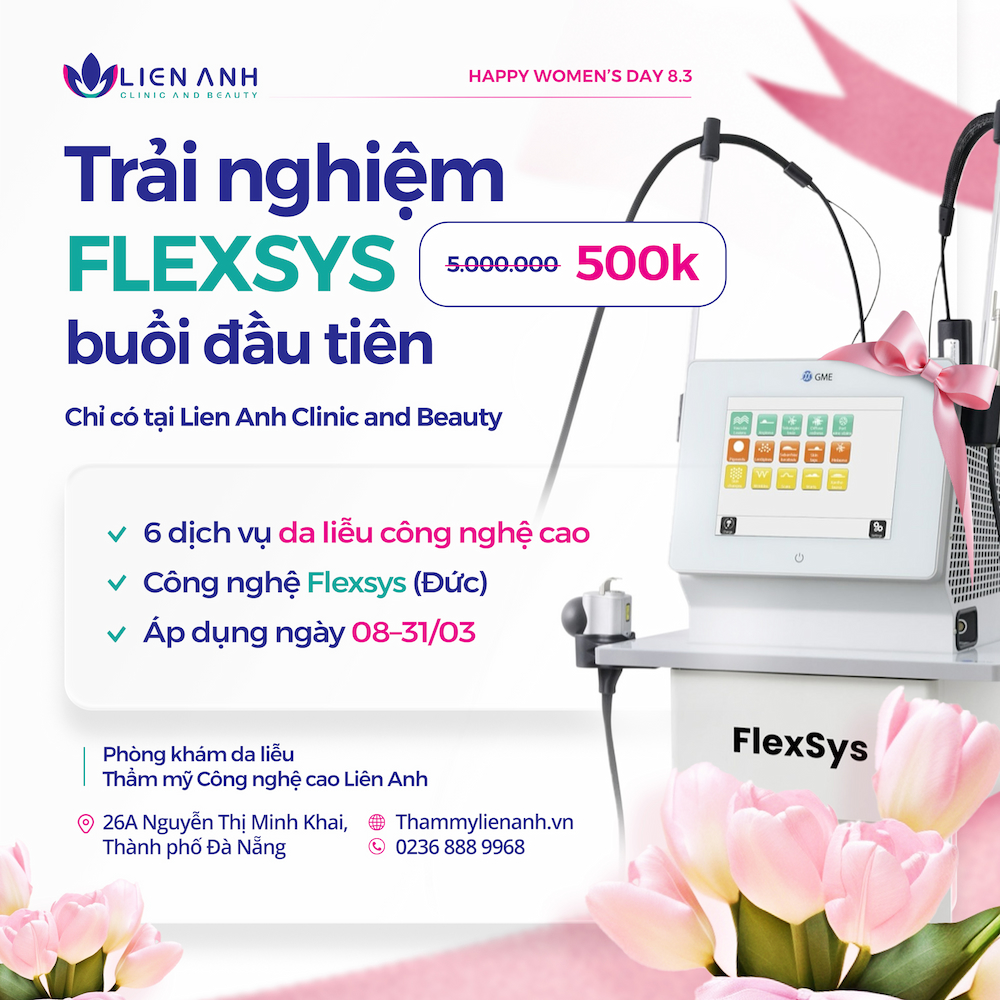 Nhân dịp Ngày Quốc tế Phụ nữ 8/3, Phòng khám Da liễu Thẩm mỹ Công nghệ cao Liên Anh gửi đến phái đẹp một món quà ý nghĩa: cơ hội trải nghiệm công nghệ da liễu Flexsys (Đức) – công nghệ chăm sóc da hiện đại đang được quan tâm trong năm 2026 với chi phí chỉ 500.000 VNĐ cho buổi đầu tiên